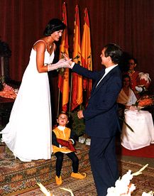 A los acordes de una nueva marcha, la Reina descendió del estrado, dando esta vez el brazo al poeta galardonado y seguida de su corte de honor, siendo despedidos con cariñosos aplausos.