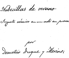 La primera de las obras en cuyo análisis nos centraremos. Nubecillas de verano, es cronológicamente la primera pieza dramática original de don Demetrio que conservamos (1). Se trata de un juguete cómico compuesto por veintinueve escenas y fechado en 1897. El subgénero del juguete alcanzó gran auge a finales del siglo XIX dentro de lo que se denominaba teatro por horas, organización del evento teatral que consistía en ofrecer al público cuatro obras diversas de un acto, dentro de un espectáculo que duraba cuatro horas seguidas, con entradas independientes para cada una de las representaciones y precios asequibles (2).