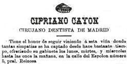 Estos ?itinerantes? dejarán de existir en las grandes poblaciones a finales de 1870, pero las pequeñas como Reinosa, que no disponían de todos los servicios, eran todavía un lugar propicio para estos profesionales. Uno de los ?itinerantes?, que después abre un establecimiento propio en Reinosa es Cipriano Cayón, cirujano dentista de Madrid, que con un anuncio que exhibía el dibujo de una boca, resaltaba la conveniencia de mantener la dentadura en buen estado. Este aspecto es muy importante, ya que para la mentalidad tradicional de la época la apariencia corporal se ponía en relación con las cualidades morales de la persona. Como reza el anuncio de Cipriano Cayón: "No hay rostro hermoso sin buena dentadura, hacer un bien a la humanidad doliente", este profesional ofrece sus servicios y sus excelencias durante dos décadas, tanto en El Ebro, como en el siguiente periódico, Campoo.