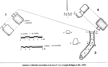 También y dentro de esta campaña se han realizado excavaciones en la zona Este, donde se ubica la cabecera de la ermita. Aquí apareció un conjunto "homogéneo" de seis tumbas excavadas en roca (Lámina II, IX a XIV), que guardan sintonía de caracteres con el resto de los enterramientos del entorno. Entenderíamos por este término, el que junto a dos que por su tamaño pudiesen albergar personas adultas (a veces de distinta altura como es nuestro caso), se unen una o más de tamaño más reducido y que pudiesen haber alojado a niños o adolescentes. Esta fórmula ha dado en ocasiones lugar a la hipótesis de enterramientos de grupos familiares, hallados también en necrópolis de este mismo horizonte cronológico e inclusive geográfico, como es el caso de Revenga (Burgos) (Castillo, 1972:13).