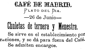 El menú elaborado por la entonces Fonda Universal, consistió en lo siguiente: Huevos a la americana. Vaca a la "Gorard". Calamares rellenos. Solomillo asado con croquetas a la italiana. Truchas a la "Chambord". Gallinas trufadas a la "Montmoreney". Crema a la "Franchipau". "Sanwichs". Queso. Fruta. Vinos: Valdepeñas, Manzanilla de Sanlucar, Champagne. Café, Cognac y cigarros. Unos hermosos puros que según la crónica fueron regalados por uno de los veraneantes asiduos, Don Felipe Marañón, quien pronunció un gracioso discurso para presentar un cajón de grandes y hermosos habanos. El cronista concluye su relato diciendo: "El Martes ni te cases ni te embarques, pero almuerza".
