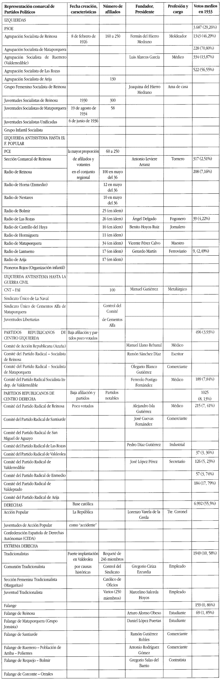 La afiliación a las organizaciones políticas obreristas y sindicales era pues muy consistente con un alto nivel de militancia comunista y en las juventudes en comparación con la media española. Tanto el PSOE como el PCE contaban con un tejido social homogéneo y regularmente distribuido en la comarca.