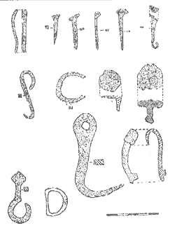 • Puntas, clavos, escarpias y ganchos destinados, tanto a su colocación sobre la estructura leñosa de la torre, como en las propias paredes pétreas de la misma. Por su tamaño destacar un posible clavo ornamental, quizás colocado en el portón de entrada.