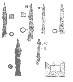 • Puntas de dardo de cabeza bipiramidal maciza, destinadas a su colocación sobre un astil de madera. Este tipo de proyectiles posiblemente fuese lanzado mediante ballesta.