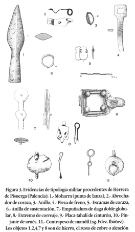 Así las élites guerreras y fundamentalmente a través de los ajuares depositados en las tumbas de la necrópolis de Monte Bernorio, nos muestran que el armamento de la época (Figura 2) estaba completamente forjado en hierro y compuesto por característicos y estilizados puñales que al haber sido hallados aquí por primera vez en aquella elevación llevan su nombre (Griño. 1989). Las empuñaduras de estas armas y las vainas donde eran transportados, se encontraban bellamente decorados con plata (nielados), al igual que sus fundas rematadas en discos en número de cuatro o tan solo uno (Alonso López, Cerdán y Filloy Nieva. 1999). Estos iban colgando oblicuamente de un cinturón de cuero con hebilla metálica mediante un complicado sistema en el cual intervienen varias piezas metálicas de forma curva (tahalí), que también se decoraban con nielados. Así como lanzas y venablos de agudas puntas y cortantes filos de delineación flameante o recta, cuchillos afalcatados y pequeños escudos posiblemente circulares (caetra) con umbos hemiesféricos o troncocónicos que eran colocados en su centro para proteger la mano que los asía. Es posible que buena parte de los fragmentos de arreos de caballo que han sido encontrados en los poblados de Las Rabas en Celada Marlantes, Monte Bernorio y Cildá, perteneciesen a esta clase dirigente. Todo ello resultaría muy vistoso y harían ciertamente altiva la actitud de sus portadores, acrecentando el respeto y la admiración de sus congéneres.