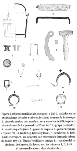 Aparte hay constancia fehaciente de un sinfín de objetos muy diversos de carácter civil. representando a una variada gama de actividades que nada tiene que ver con la guerra, cuyos restos hemos hallado va sea de forma completa o testimonialmente por algún fragmento. Así, y desde instrumentos de uso personal (limpiauñas, strígiles...) hasta adornos para arneses de los caballos, ornato personal (anillos, pulseras, fíbulas...) O bien herramientas para los oficios que la legión debía llevar a cabo como pueden ser la agricultura, ganadería, albañilería, cantería, carpintería, cocina. caza, pesca, etc. (Fernández Ibáñez, 1992;1994).