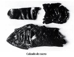 Igualmente en los pozos, por la aludida abundancia de materia orgánica, se han hallado trozos de cuero de pieles de animales en proceso de preparación para diferentes fines así como piezas de calzado de cuero formadas a base de suelas superpuestas. Los hallazgos están en consonancia con la información de Estrabón que menciona la existencia de barcos de cuero utilizados para pescar como Avieno (14). César (15) y Sidonio Apolinar (16) citan en los oistrimnios de Bretaña, britanos y sajones respectivamente.