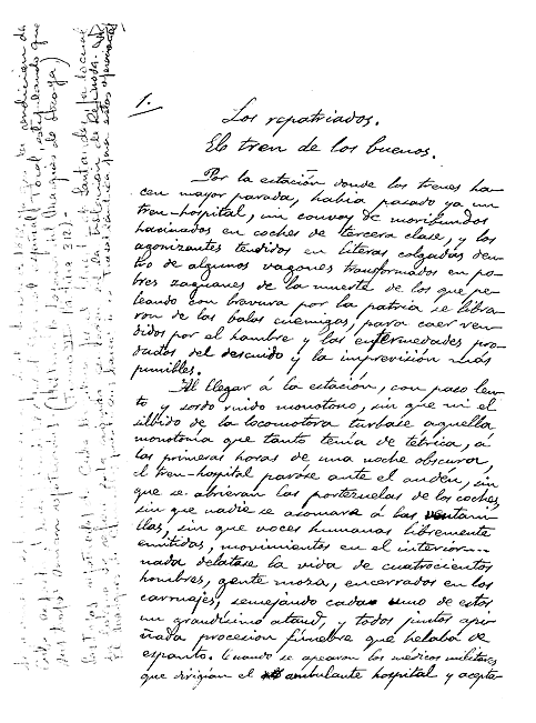 Los buenos parecían espectros de hombres, macilentos, descarnados, amarillos, terrosos. Sin alegría en sus rostros, mortecinas las miradas, cabizbajos, inseguros en el andar, huesudas y carcomidas las manos, mal aviados con los trajes de rayadillo que no pueden mirar ya bien nuestros ojos, sin hablar si no se les preguntaba... ¿Quién creyera que conducía aquel tren seiscientos jóvenes en la flor de su primera juventud?...
