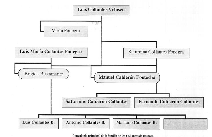 El breve repaso biográfico por algunos de los jalones familiares de dicho linaje comienza con los nombres de quienes formaron su familia en esa vivienda de Reinosa de 1805: Luis Collantes Fonegra y su cuñado Manuel Calderón Fontecha. Hijos, carnal y político respectivamente, de un hidalgo marino campurriano (de Matamorosa) que ya hizo alguna fortuna a la sombra del casi todopoderoso conde de Isla, del que fue avispado colaborador en una delegación de sus negocios en Londres, donde, por cierto, nació Don Luis.