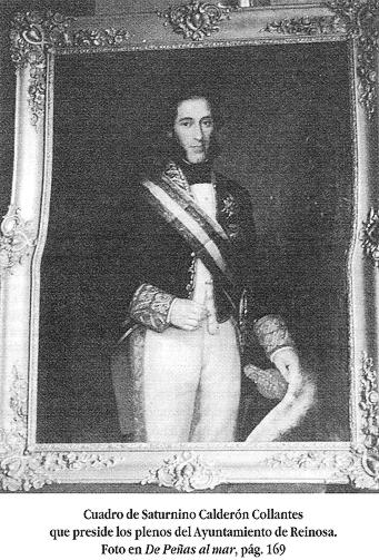 SATURNINO CALDERÓN COLLANTES Formación - Carrera jurídica en La Coruña - Poeta vocacional Carrera profesional - Presidente Sala contencioso Tribunal Supremo - Consejero Real Cargos políticos - Diputado 1834-36,1837-40 y 1844-1847 - Senador vitalicio a partir de 1847 Varios ministerios: Gobernación (1840) Comercio, Instrucción y Obras Públicas (1850) Estado 1858-63 Retrato en plenario de Ayuntamiento de Reinosa |