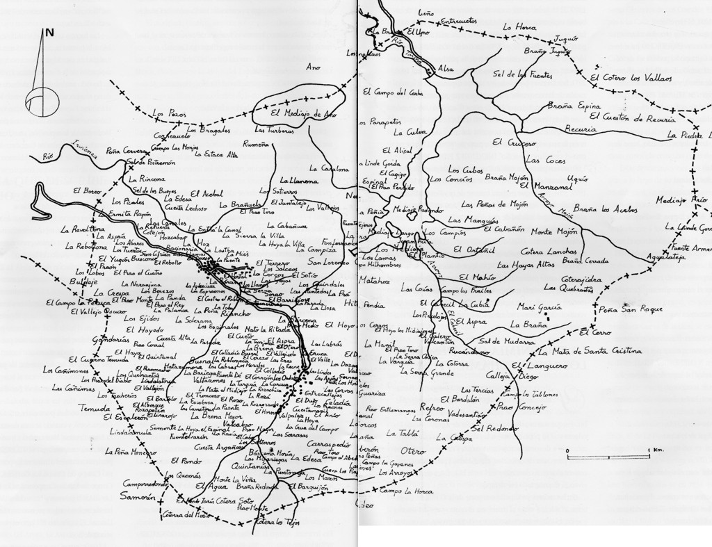Por ello, además, la densidad toponímica resulta directamente proporcional al interés e intensidad en el uso y control del espacio; y esto es especialmente así en cualquier lugar y fundamentalmente en un espacio aldeano como el que aquí vamos a tratar. La densidad disminuye del interior al exterior de los distintos ruedos en torno a los pueblos. Casas, barrios y callejas, huertos, tierras y mieses, derecheras y ejidos, prados y praderas, brañas y montes marcan la gradación, de menos a más, de la superficie a la que se aplica cada una de las denominaciones, cada uno de los nombres con que se conoce cada porción del valle que los habitantes de Aguayo reconocen porque les han dado nombre (Ver mapa págs. 30-31).