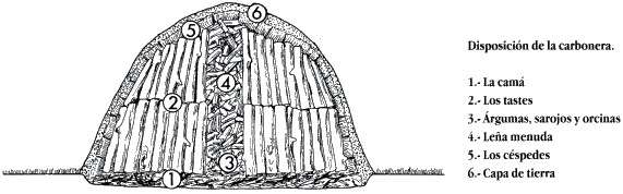 Se levantaban, pues, dos pisos de trozos de madera ?tastes en posición vertical y desde dentro hacia afuera, sobre un lecho camá- para que la leña no toque el suelo, como ha sido tradicional en el norte de España; frente a la tradición transpirenaica de armar en horizontal.