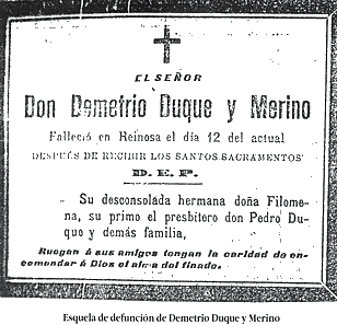 Don Demetrio nació en Reinosa el 22 de diciembre de 1844, fueron sus padres D. Nicolás Duque Santos natural de Areños en la comarca de La Pernía de la provincia de Palencia, y su madre doña Teresa Merino Sierra de Quintanar de Rueda, provincia de León.
