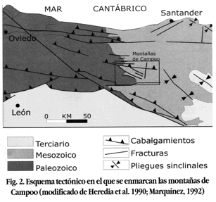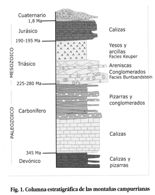 La montaña campurriana se localiza en una encrucijada geológica, en el contacto entre la cobertera mesozoica y el zócalo hercínico (figura 1). El zócalo constituye los restos arrasados de una antigua cordillera, fuertemente deformada y sobre él reposa la cobertera mesozoica, formada en el Triásico y Jurásico. Como