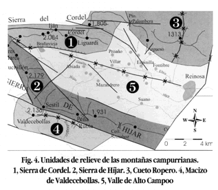 La estructura principal es el sinclinal de Abiada (Alto Campoo) limitado al norte y al sur por fracturas de direcciones NW-SE y compartimentado en su interior por fallas de las mismas direcciones que lo han deformado, generando un flanco verticali-zado al norte y uno más tendido al sur, donde se sitúan las sierras de Híjar y el Cordel. El flanco meridional cabalga sobre otro sinclinal de dimensiones menores, también delimitado por fracturas al sur, que forma el macizo de Valdecebollas. Los materiales estratificados muy diversos (calizas, margas, areniscas, conglomerados, arcillas y yesos) respondieron de modos diferentes ante los esfuerzos tectónicos y la erosión. Los afloramientos de arcillas y yesos, emplazados unas veces por su comportamiento halocinético en diapiros, como sucede en Reinosa o Aguilar de Campoo, y otras conformes con la sucesión estratigráfica, ofrecen muy poca resistencia a la erosión, y tienden a generar rellanos y depresiones. Por el contrario, los materiales más resistentes, emplazados en los frentes de cabalgamiento, los conglomerados o las calizas, generan una erosión diferencial que posibilita la permanencia de crestas conglomeráticas o calcáreas, en las cumbres de las sierras campurrianas. En este ámbito litoestructural, las montañas campurrianas se articulan en torno al valle de Alto Campoo, con cuatro unidades morfoestructurales principales (figura 4).