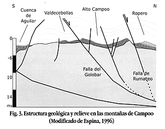 El relieve de Campoo adquiere sus características esenciales con los movimientos tectónicos que tienen lugar desde finales del Cretácico hasta el Oligoceno, en la denominada orogenia alpina. Es en esta fase cuando se levantan, se pliegan y fracturan los materiales generados previamente (Hernández Pacheco, 1944; Heredia, et al. 1990; IGME, 1986).