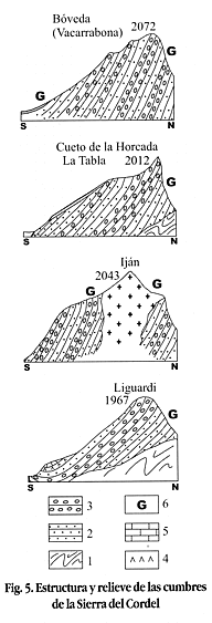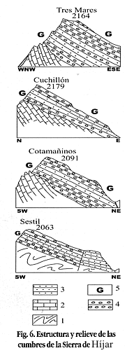 - La Sierra de Híjar se extiende también desde el punto de inflexión del Tres Mares, en dirección NW-SE hasta el Sestil (2063), para girar a una posición meridiana (WNW-ESE) hasta el collado de Somahoz, desde donde el cordal continúa hasta el Arroyo Marlantes y la tenue divisoria del Pozazal. En el primer tramo alcanza la mayor altitud de las montañas campurrianas (Cuchillón, 2174 m) para iniciar un descenso paulatino (Cotamañinos, 2144; Cueto Mañín, 2122) que desde el Sestil no supera ya los 2000 metros (Peña Rubia, 1933; Cuesta Labra, 1948). Este cordal continuo forma parte del flanco meridional del sinclinorio de Abiada, constituido por conglomerados triásicos con buzamientos en torno a los 25°. El relieve es conforme con las estructuras, un dorso de suave pendiente modificado parcialmente por el glaciarismo, y un frente abrupto (figura 6). El buzamiento, menor que en El Cordel, genera unas montañas disimétricas. Al norte presenta pendientes más suaves conformes con los dorsos que siguen la inclinación de los estratos, compartimentados por de dirección NW-SE. Esta morfología es muy característica en Tres Mares, Cuchillón o Cotamañinos con cumbres modeladas en los conglomerados triásicos que generan un cordal voluminoso y disimétrico. Al sur, la porción culminante de los frentes