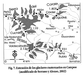 En el entorno de las montañas campurrianas se ha conservado la huella de 26 glaciares (figura 7) que generaron formas de erosión, circos glaciares, cubetas de sobreexcavación, hoy colmatadas, y umbrales. La morfología es muy variada en función de la estructura geológica, la disposición del glaciar y su entidad en el pasado. Destacan las formas de mayor desarrollo, en la vertiente noreste de la Sierra de Híjar, con circos poco encajados y de fuerte pendiente a favor del buzamiento de los estratos (foto 6). La acumulación de hielo en Guzmerones, Hoyo Sacro, Pidruecos, Las Hoyas, Los Asnos o Tres Mares, unidas en una lengua, propició el glaciar de mayor entidad, el glaciar de Brañavieja, de 2.800 metros de longitud y 150 metros de espesor, que difluía en dos lenguas, una al Híjar y otra al Guares. En Valdecebollas, el circo de Sel de la Fuente también muestra amplitud y complejidad, escalonado en función de la estructura geológica que soportó un glaciar de 2 kms de longitud cuya lengua difluía hacia el Híjar y hacia el Pisuerga (foto 7). Los restantes glaciares eran de circo, con lenguas reducidas que sólo excepcionalmente superaban el kilómetro de longitud en Cotamañinos o en la vertiente norte de la Sierra del Cordel, donde la orientación y los fuertes desniveles de las paredes verticales propiciaron una abundante alimentación y el desarrollo de extensos glaciares que alcanzaban cotas muy bajas. Los glaciares en su conjunto se caracterizaron por las lenguas cortas, encajadas en el sustrato y con fuertes pendientes que dieron lugar a un amplio cortejo de formas. Circos encajados en relieves aplanados, con cubetas profundas como Cuenca Bucer, Cuenca Vitor, Sel de Brañosera, la Cuenca de Rumaceo u Orbaneja, o en crestas aristadas como Cuenca Gen, Cuenca Cen, o Cuenca del Hoyo. Todas ellas constituyen rellanos entre laderas escarpadas utilizados para pastos, seles y brañas, que encuentran en los circos y cubetas glaciares un espacio propicio para una explotación que continúa en la actualidad. En los frentes de las Sierras de Híjar, vertiente suroeste, y del Cordel, vertiente norte, le circos son más amplios y encajados (foto 8), pues la acción glaciar no se ha impuesto con la misma eficacia, dado el desnivel la energía del relieve preglaciar.