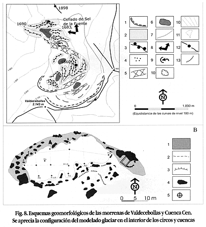 La labor erosiva de los glaciares fue la más capaz para generar relieves en las cumbres de las montañas campurrianas. En los circos y valles glaciares depositaron morrenas -formas de acumulación generadas por el transporte y la sedimentación glacial en sus frentes y márgenes-, que caracterizan, ya en detalle, el interior de las formas erosivas y sobre todo son un testigo de la extensión y evolución de los glaciares, y del clima. Existen complejos morrénicos -sucesiones de morrenas arquedas o rectilineas-, de gran riqueza y variedad, como los de Guares, Brañavieja, con dos arcos seccionados por la carretera del collado de la Fuente del Chivo, que permite conocer su estructura interna, o en Orbaneja, Cuenca de Rumaceo, Cuenca Gen y Cuenca Vitor. En Valdecebollas, entre la porción frontal de Covarrés y la cumbre de Valdecebollas, se suceden 17 arcos morrénicos, con elementos lacustres, kársticos y nivales que enriquecen este singular ámbito glaciar de la montaña campurriana (figura 8).