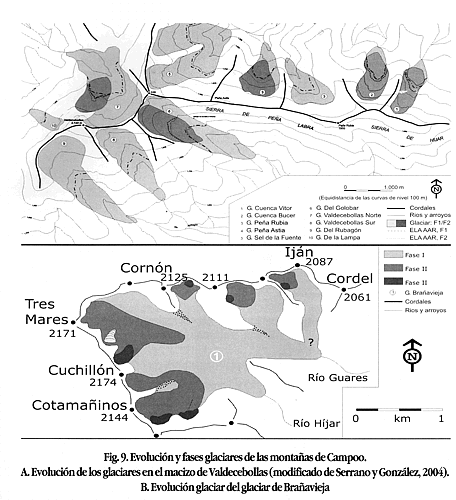 La acción glaciar actuó en diferentes momentos con distintas intensidades y repercusiones geomorfológicas (figura 9). Las formas glaciares se modelan y remodelan durante el último periodo glaciar y en sucesivas fases de retroceso y equilibrio (Serrano y Gutiérrez, 2000; 2002; Serrano y González, 2004):