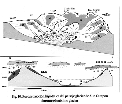 Máximo Glaciar las precipitaciones procedentes del N, NW y SW alimentarían abundantemente los macizos más protegidos como Valcedebollas o los más expuestos, como el Cordel, propiciando una montaña glaciada en todas sus vertientes. En la fase de retroceso se aprecia una fuerte disimetría, con los glaciares alojados preferentemente en orientaciones septentrionales, lo que evoca unas condiciones más secas, con menos alimentación y una conservación preferente en orientaciones favorables (norte y sureste). La última fase es propia de un glaciarismo marginal, asociado a la conservación estival en laderas norte con muy escasa insolación. A partir de los cálculos de Ohmura et al. (1992) se puede establecer una relación teórica entre las precipitaciones y las condiciones térmicas en el entorno de los glaciares. En Campoo, suponiendo unas precipitaciones moderadas, para un ámbito oceánico, y menores que las actuales, de 1000-1500 mm/año en el Cordel, y 500-1.000 mm/año en la Sierra de Híjar, se puede establecer que la Tª media anual a 860 metros sería entre 6°C y 8°C; a 1.000 m de altitud, entre 4,5°C y 6,5°C; y a 1.800 m, por debajo de la MELA del máximo glaciar, entre 0°C y 2°C. Este hecho sugiere que no existía un clima extremo en su rigurosidad por debajo de los 1.800 metros, con unas condiciones térmicas medias superiores a 0°C que imposibilitan la existencia de suelos permanentemente helados y propicia el desarrollo vegetal, favorecido por la disponibilidad hídrica procedente de la fusión glaciar, nival y las precipitaciones. Durante los meses de verano existiría una importante disponibilidad hídrica, junto a un periodo suficientemente cálido, con más de dos meses de temperaturas medias por encima de 10°C, que propiciarían una importante biomasa en las laderas medias y bajas del valle del Campoo, allí donde la dinámica fluvial y fluvioglaciar no fuera muy agresiva. Podemos suponer que el valle estaría ocupado por formaciones arbóreas abiertas hasta los 1.250-1.300 metros, y por un medio supraforestal con pradera y arbustos leñosos que propiciaría un rico y complementario ecosistema (figura 10), capaz de atraer a grupos de cazadores en el periodo estival, en un ambiente habitable y rico en oportunidades para grupos humanos, como parecen atestiguar los restos encontrados en Campoo (Gutiérrez 1990,1995, 2000).