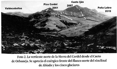 - La Sierra del Cordel forma el flanco septentrional de las montañas campurrianas, desde el Tres Mares (2171) hasta Palombera en una sucesión de cumbres que superan más de dos mil metros alineadas de oeste a este conforme con las directrices estructurales. Esta sierra es el flanco septentrional del sinclinal de Abiada, formado por los conglomerados y areniscas de las facies Bunt-sandstein, y genera un relieve disimétrico, un cres-terío poco esbelto y un relieve enérgico a favor de los frentes de los estratos al norte (foto 2), sobre Polaciones y el Saja, y unas pendientes más suaves a favor de los dorsos al Sur.