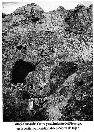 el glaciarismo ha revitalizado las laderas, con pendientes mayores y escarpes, así como una erosión diferencial que propicia relieves enérgicos en los estratos verticales de caliza, con procesos kársticos singulares, entre los que destacan Covarrés y la Fuente de Cobre, nacimiento del Pisuerga. Es este un lugar singular un sistema kárstico de 2,5 km de longitud, que supera 130 metros de desnivel, alineado en una fractura de dirección NE-SW (Alcalde et al. 1983; Rossi y Ortiz, 1990). Drena la cuenca de Sel de la Fuente y surge, en el contacto con las turbiditas, en la magnifica oquedad de Fuente de Cobre (foto 5).