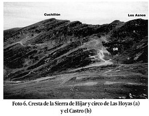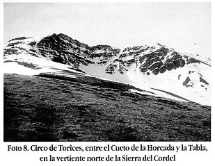 - Fase de altitud. En los circos más elevados, siempre en orientaciones septentrionales y al pie de cantiles y paredes norte, se encuentran morrenas en Peña el Rostro, Hoyo Sacro, Las Hoyas, Cuchillón, Cuenca Gen y Valdecebollas, depositadas por muy pequeños glaciares, de dimensiones en torno a los 200-400 metros de longitud, así como un glaciar rocoso en Los Asnos, hoy casi totalmente destruido por las pistas de esquí (foto 6). El límite de equilibrio glaciar se situaría en torno a 1900/1960 m s.n.m. En la actualidad no se conoce la edad de esta fase, pero por correlación con la evolución glaciar pirenaica (Serrano y Martínez de Pisón, 1994) proponemos como hipótesis su atribución al periodo Tardiglaciar, fechado entre 14.000-10.000 años B.P.