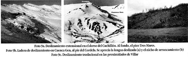 - Grandes movimientos en masa: Relacionados con la estructura geológica, los procesos de descompresión postglaciar y la acción fluvial, se desarrollan importantes movimientos en masa, "deslizamientos de ladera" y "extensiones laterales", que implican una rápida movilización de los materiales hacia las zonas bajas del valle. La montaña de Campoo es un medio muy dinámico e inestable derivado de la presencia de unos materiales incompetentes, las arcillas y yesos, que posibilitan procesos a veces de gran espectacularidad. Sus dimensiones son muy variables, afectando unas veces a unos pocos metros y otras a miles de metros cúbicos de material. En los contactos entre los materiales incompetentes y las calizas triásicas y jurásicas o los conglomerados es posible observar movimientos en masa de grandes dimensiones. Destacan las caídas y desplazamientos de bloques por descalzamiento de los materiales infrayacentes, más fáciles de erosionar, bien visibles en los conglomerados de la vertiente norte del Cuchillón (Foto 9a), pero también son importantes los que afectan a la ladera de solana del arroyo del Guares, en la loma ubicada al Oeste de Abiada, donde la incisión del Guares en las arcillas subyacentes induce a la inestabilidad y al movimiento de las calizas y dolomías compartimentadas en grandes bloques desgajados de la serie culminante, o en Cuenca Gen (foto 9b). En otras ocasiones es la presencia de arcillas y yesos asociados a fracturas y erosionados en su base por la acción torrencial o fluvial, lo que moviliza las laderas. Es lo que sucede en la ladera de deslizamiento, plenamente activa, donde se sitúa el circuito de esquí de fondo de Brañavieja, o el movimiento en masa rotacional de Guarizas, junto al Ebro, o los de Villar, junto a la carretera C628 (foto 9c).