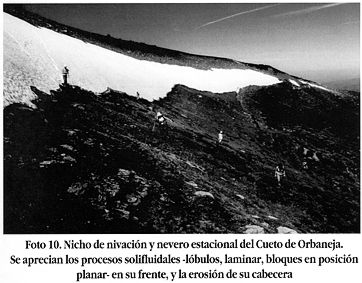 La permanencia de los neveros hasta el verano y su fusión lenta impide la colonización vegetal, genera saturaciones, arroyada laminar de las aguas fundidas y cambios térmicos en los contactos entre la nieve y el suelo, que producen los característicos "nichos de nivación" que marcan las crestas en las sierras de Híjar y el Cordel -con los magníficos ejemplos de Liguardi o Cueto Orbaneja (Foto 10)-, y "enlosados nivales", clastos aplanados que forman un pavimento casi continuo en superficies métricas a decamétricas, por saturación y exportación de los finos. El congelamiento de la capa superior en el otoño y los cambios de volumen generan pequeñas formas que complementan los procesos descritos. Finalmente, la incorporación rápida de agua líquida sobre formaciones saturadas previamente, provoca su desplazamiento rápido mediante los denominados "flujos de derrubios", coladas de clastos con finos saturadas en agua y desplazadas a gran velocidad, que depositan una acumulación de clastos digitada, muy característicos de las vertientes graníticas del pico Iján. En esta cumbre, así como en casi toda la vertiente septentrional de la Sierra del Cordel, existen también canales de aludes de reducidas dimensiones.