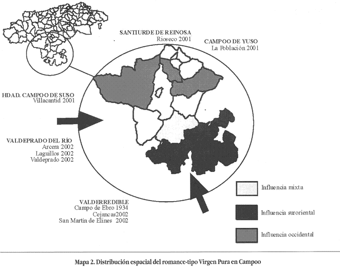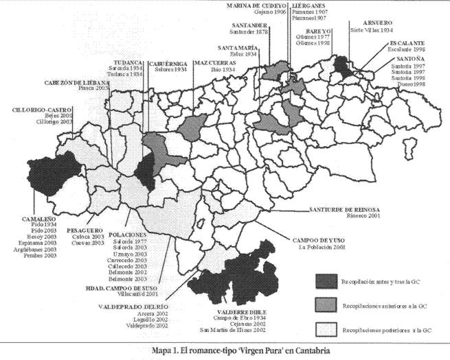 El mérito de esta inaugural recopilación es compartido por otras versiones cántabras procedentes de Selores (Cabuérniga), Pido (Camaleño), Castillo Siete Villas (Arnuero), Esles (Santa María de Cayón), Tudanca y Sarceda (Tudanca), e Ibio (Mazcuerras). Desde luego que lo salpicado de la muestra evidencia el grado de difusión de este romance en toda Cantabria. De esta forma, estas versiones son una pequeña prueba de la magnífica labor realizada. Indicativo es el hecho de que las recopilaciones del romance-tipo "Virgen Pura" representan únicamente el 1,3% de total de las variantes que reúnen.