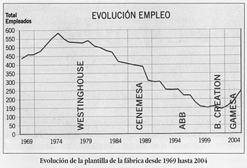 El gráfico adjunto muestra la evolución de la plantilla de la fábrica desde 1969 hasta la fecha, a final de cada ejercicio. Como datos para la historia, 1975 fue el año de mayor ocupación, con 575 empleados, y 2002 el de menor nivel de empleo, con 138 trabajadores. A pesar de los altibajos habidos en su trayectoria, la fábrica ha sobrevivido en buena medida por la capacitación profesional y empeño de sus empleados, que han sido los activos más valorados por sus sucesivos propietarios.